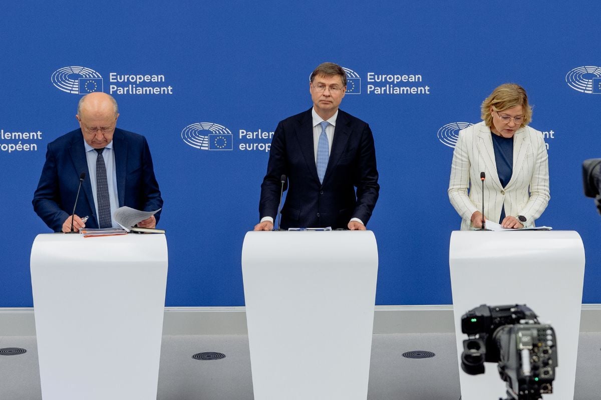 Andrius Kubilius (commissaire à la politique étrangère de l’UE), Valdis Dombrovskis (commissaire en charge du commerce) et Henna Virkkunen (commissaire aux transports) © Commission européenne
